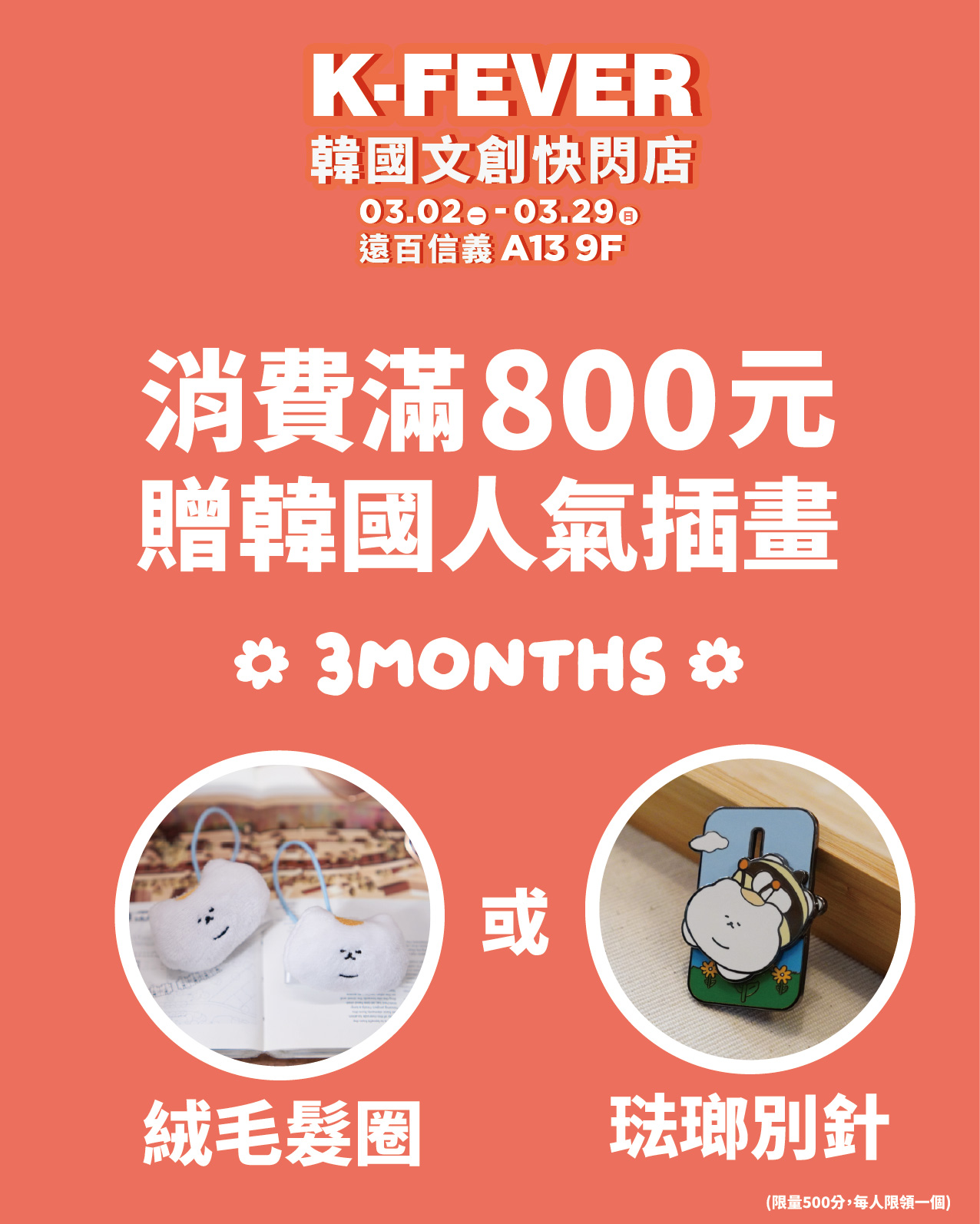 即可獲得韓國人氣插畫 3MONTHS #絨毛髮圈 or #琺瑯別針